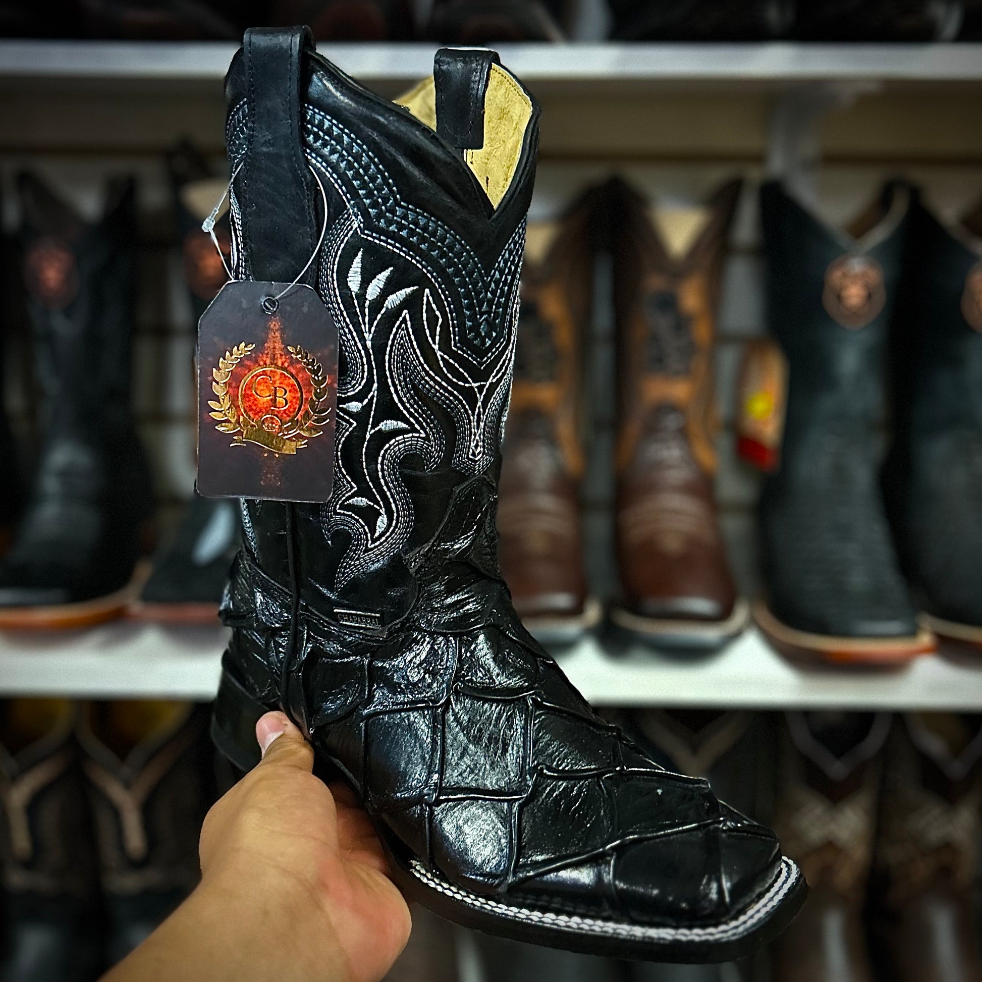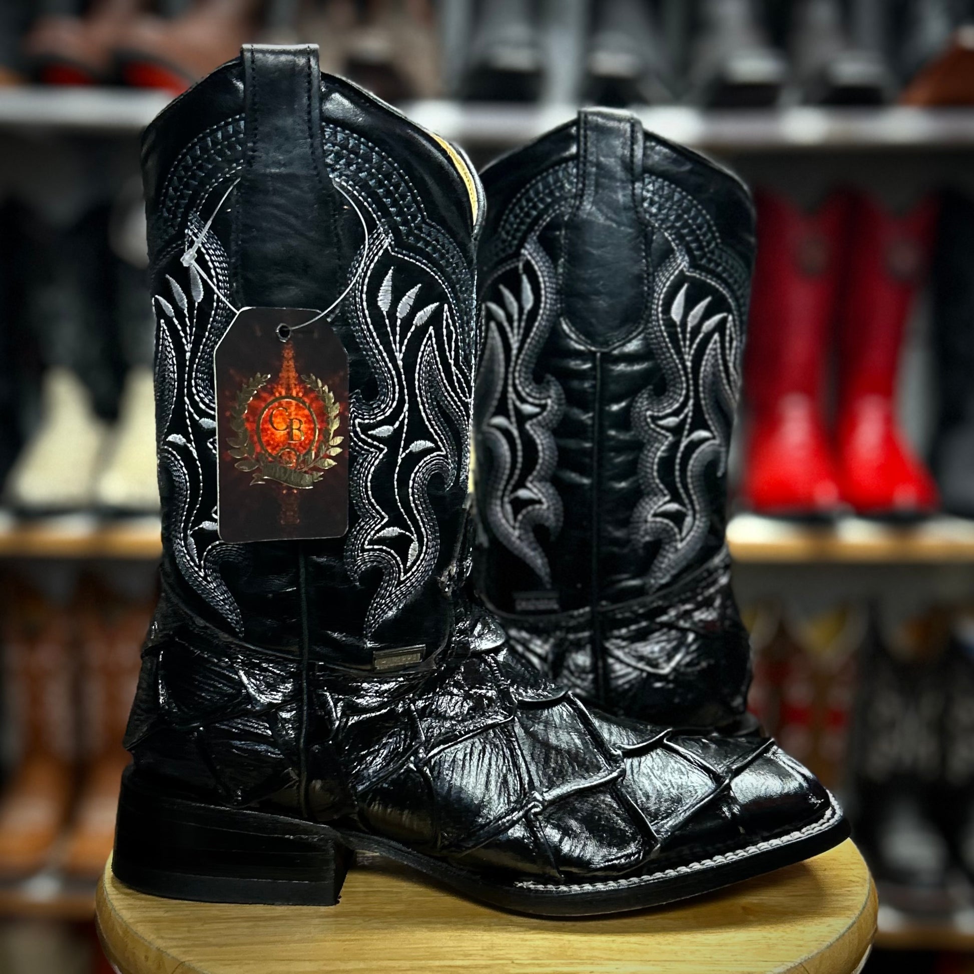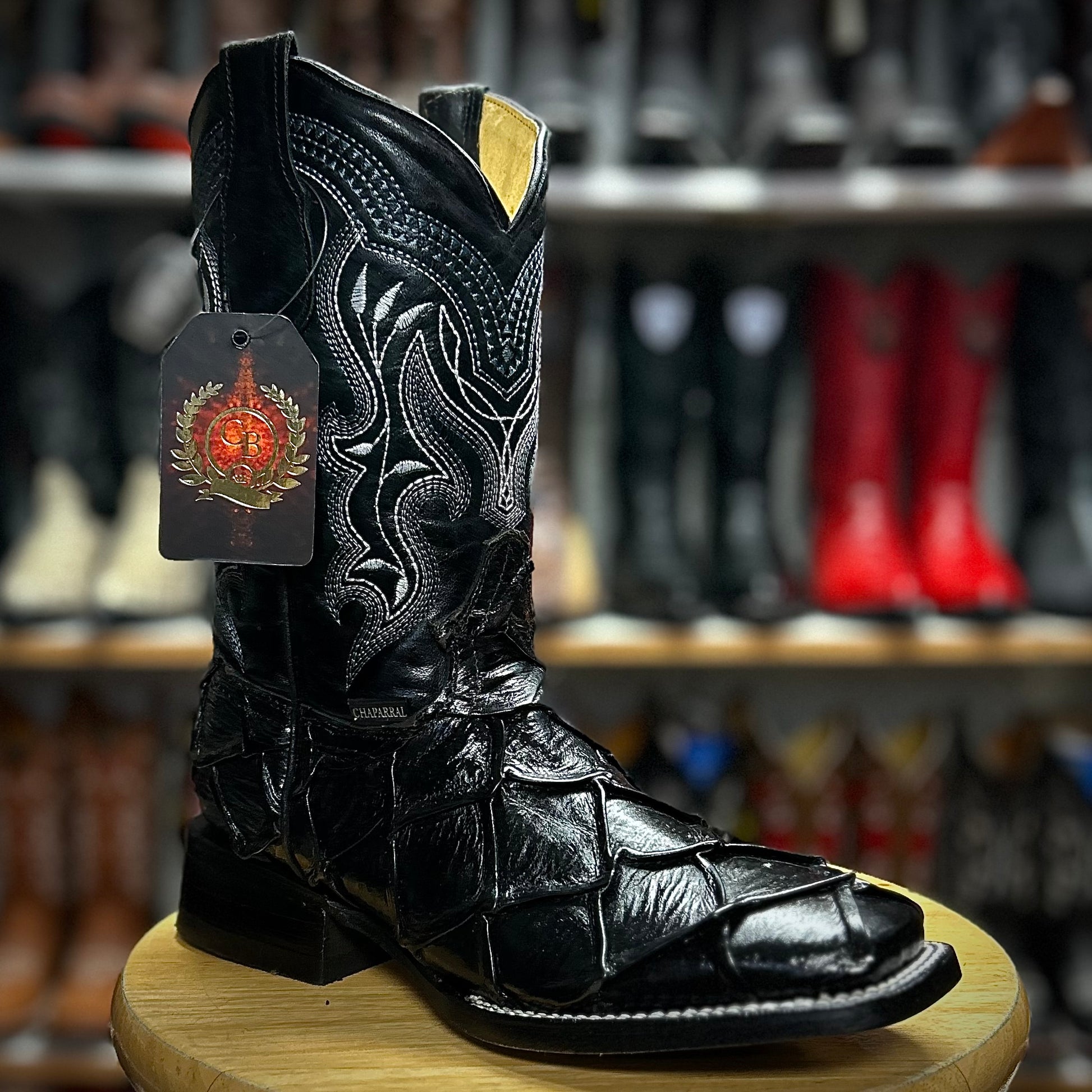 Destaca con un estilo único y audaz gracias a estas impresionantes botas negras con acabado en imitación piel de pirarucú. Inspiradas en la exótica textura del pez amazónico, estas botas combinan personalidad, elegancia y versatilidad en un solo diseño.